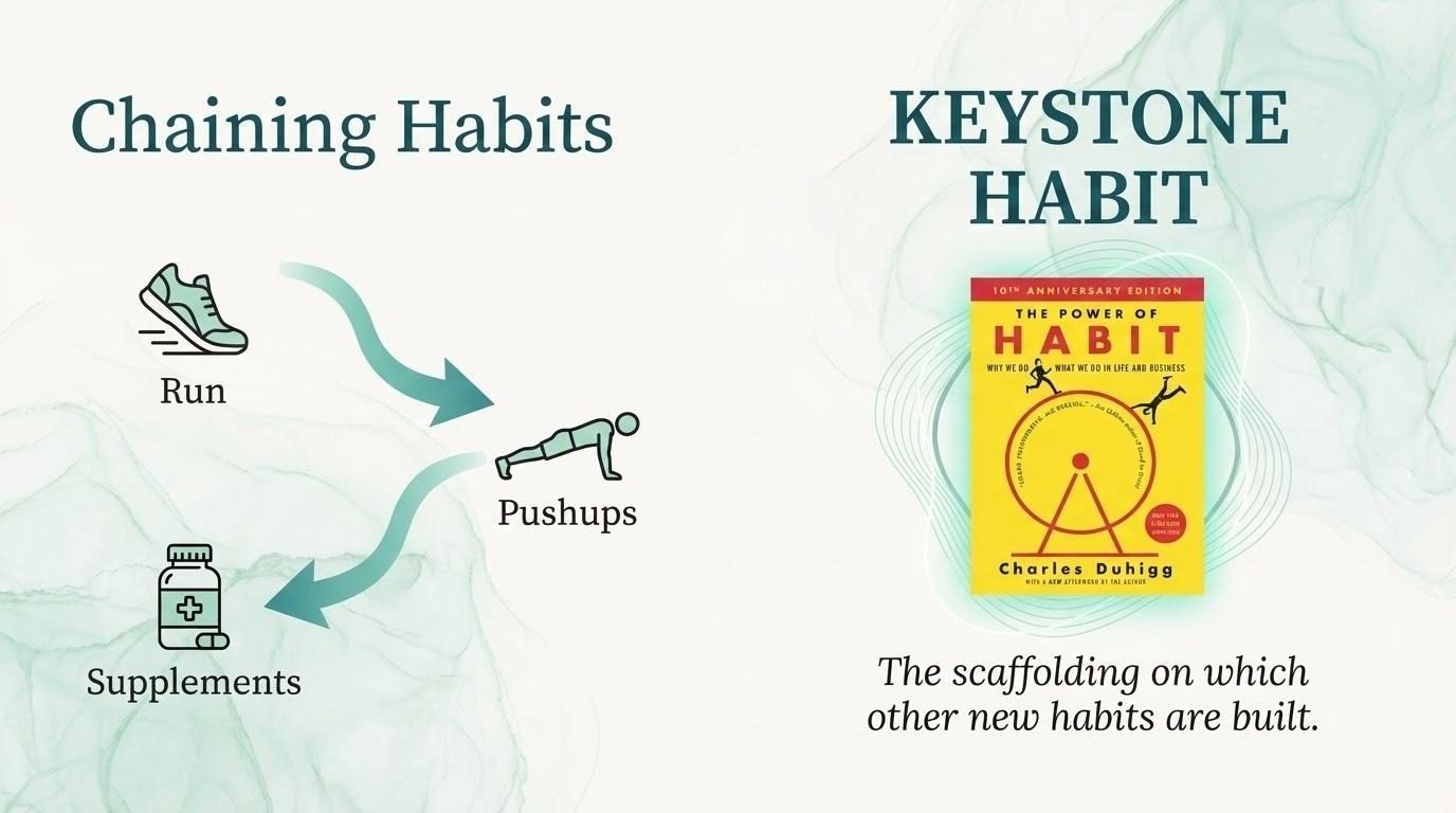 I used the running habit as the cue for the pushup habit. The reward for my run – my coffee — became the cue for another habit, because I keep the supplements right next to the coffee. Within 6 months, a singular habit became a habit chain: a morning run pushups supplements.