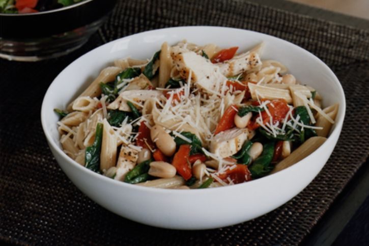 This Tuscan-inspired pasta keeps things balanced by pairing whole-wheat pasta with lean chicken, fiber-rich beans, and plenty of spinach. Garlic, herbs, and roasted red peppers add flavor without heavy sauce, so the dish feels hearty and satisfying while still light enough for a weeknight dinner.