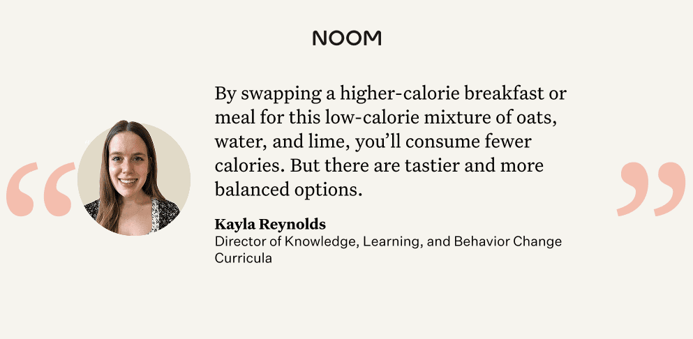 “By swapping a higher-calorie breakfast or meal for this low-calorie mixture of oats, water, and lime, you’ll consume fewer calories,” explains Kayla Reynolds, NASM CPT, the Director of Knowledge, Learning, & Behavior at Noom. “But there are tastier and more balanced options. Try hot oatmeal with berries and  low-fat Greek yogurt for added protein and fiber, or opt for a veggie-packed omelet with a sprinkle of cheese for more protein, fiber, vitamins, and minerals.”