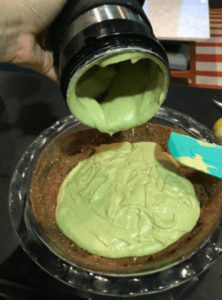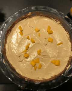 4) Diese Masse nun in die Kuchenform geben und fest drücken, auch am Rand. Decke die Kuchenform mit Frischhaltefolie ab und lege die Kuchenform in die Gefriere, während du die nächste Schicht mixt.