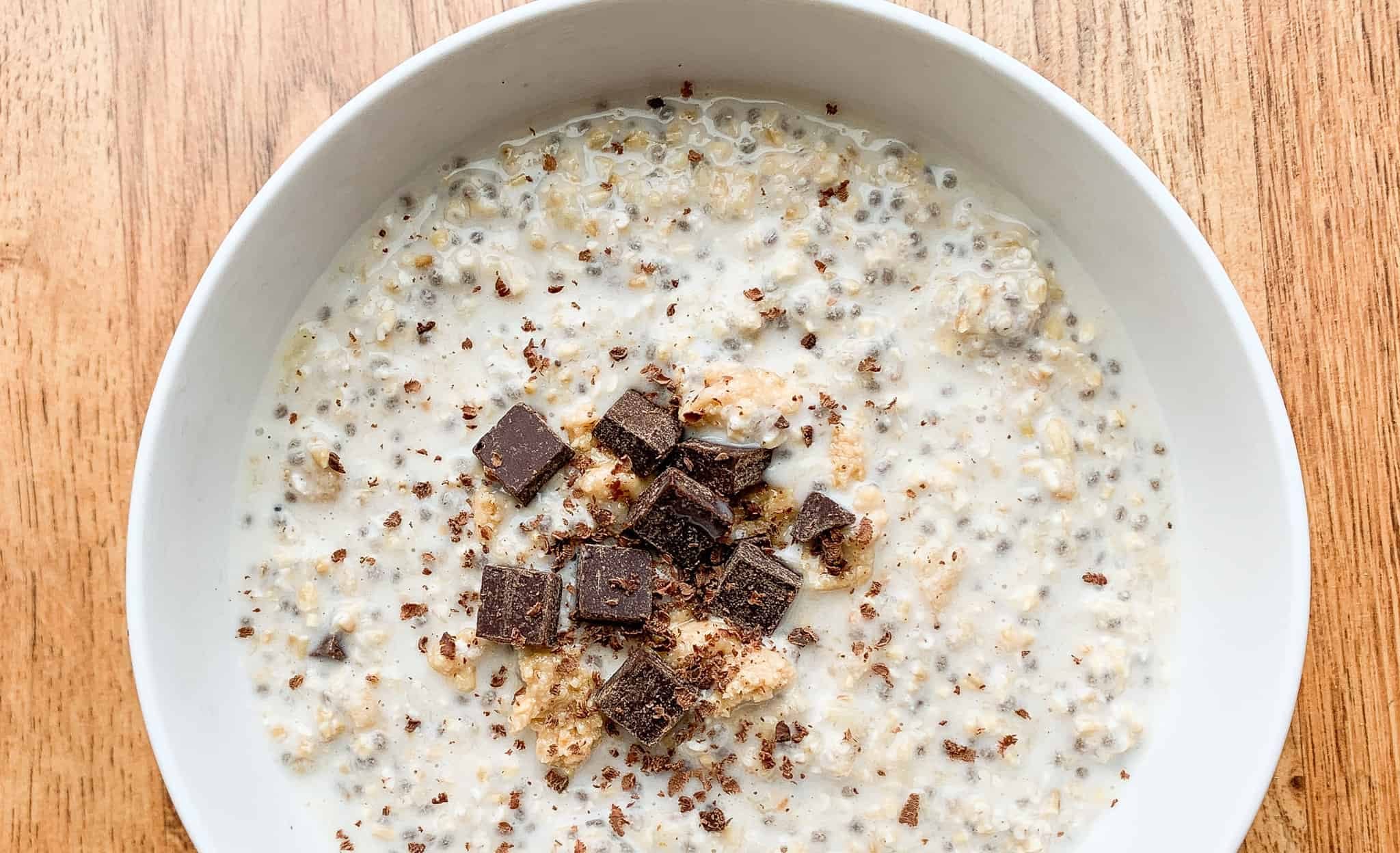 - Una vez que esté todo bien mezclado, decorar con los trozos de chocolate. Tapar el bol o frasco y refrigerar al menos por 4 horas o toda la noche.